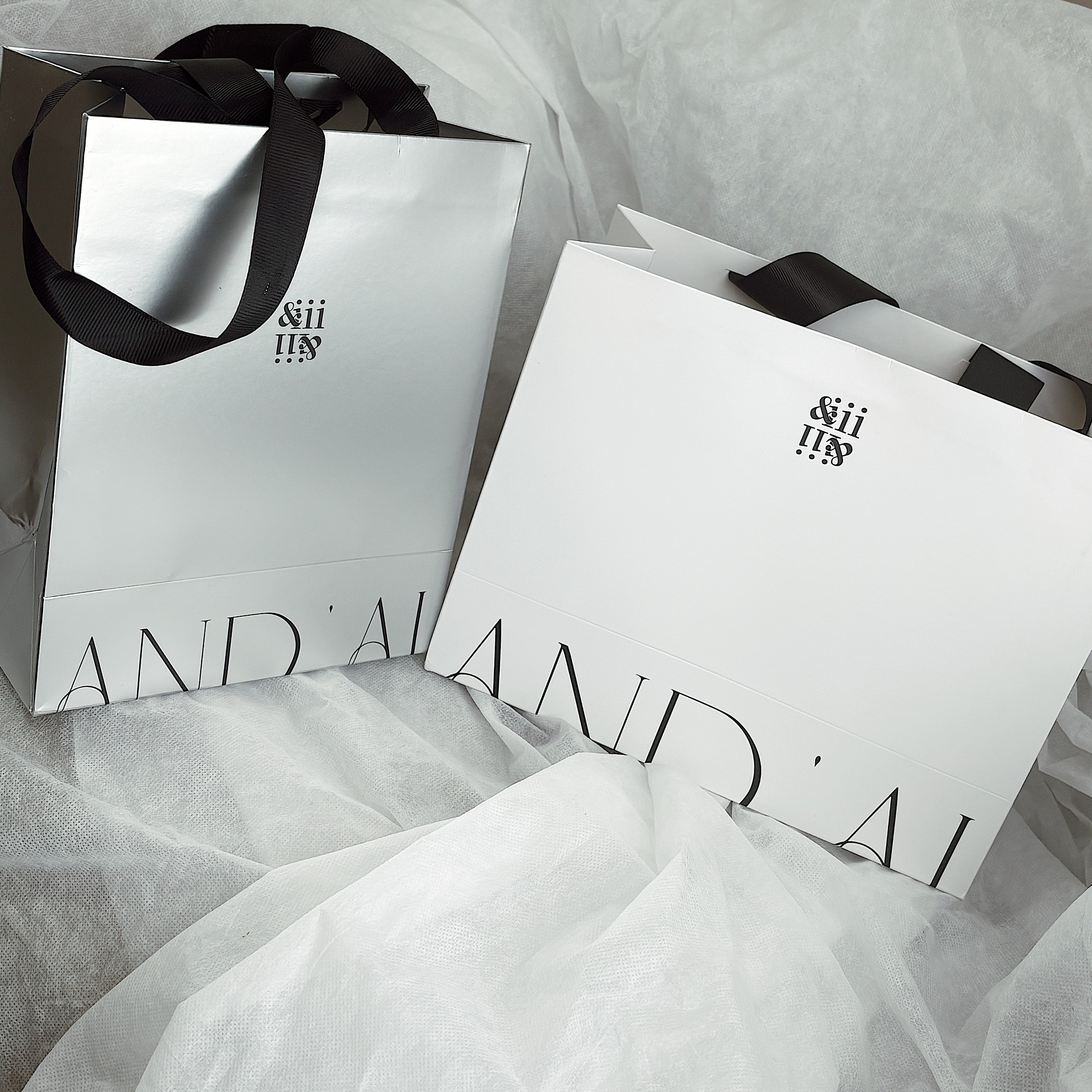 オリジナルショッパー silver 縦22.5㎝×横18㎝×マチ10㎝ white 縦2.㎝×横25㎝×マチ10㎝ プレゼント用などに✳︎ 紙袋になりますので多少の傷がございます。